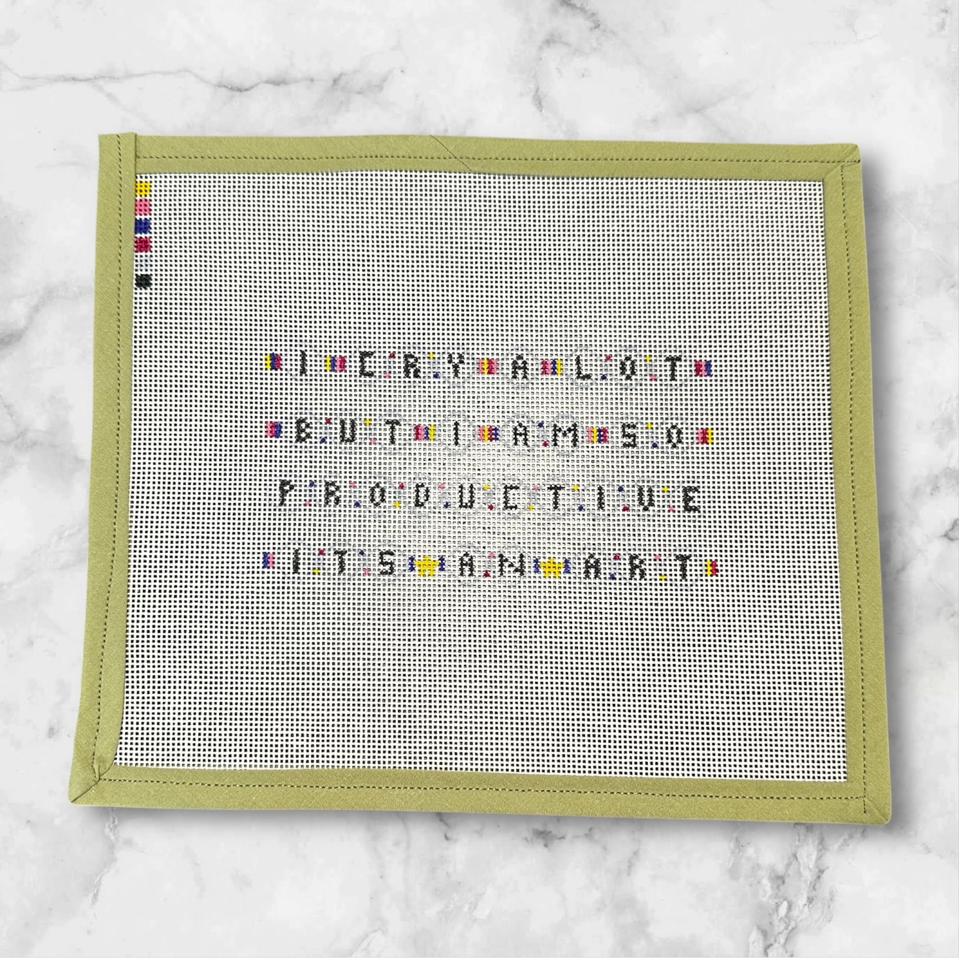 Canvas Type: Zweigart Mono Deluxe with 1/2 inch bias tape (currently using a sage green color, not the purple that is pictured)