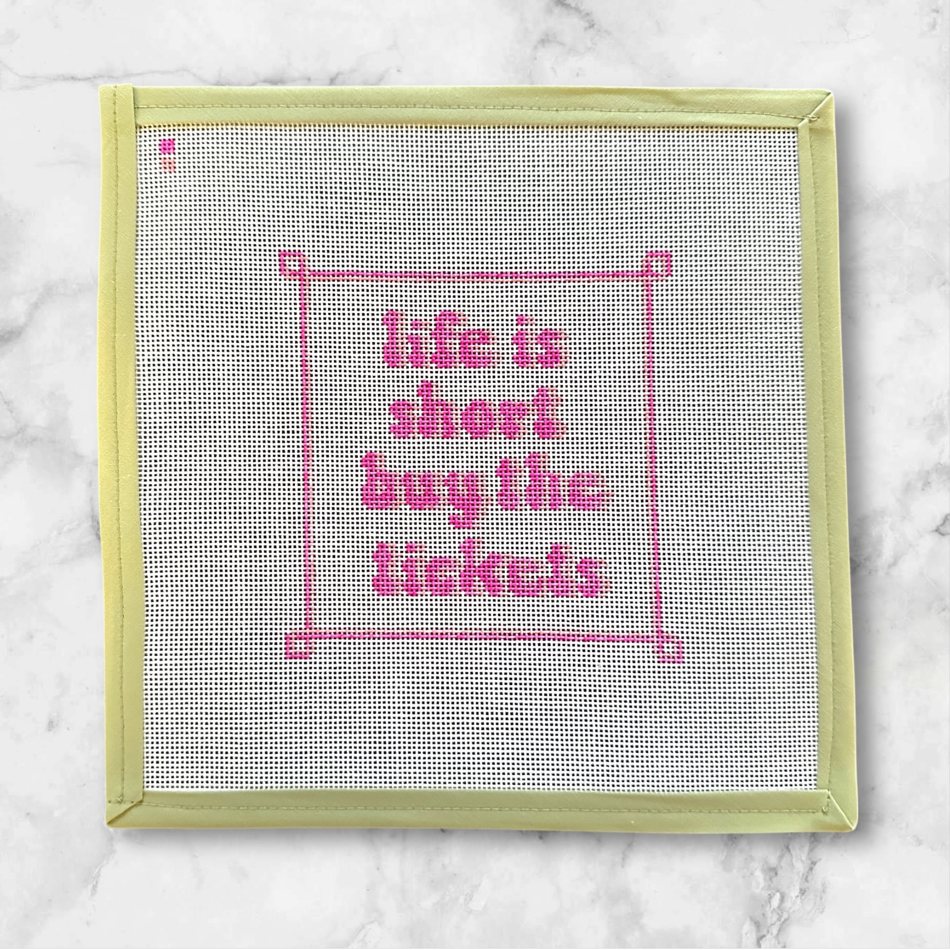 Bring your needlepoint to life with this hand-painted canvas, perfect for stitchers of all levels! Featuring a design for those of us who purchase the tickets first and figure out the details later — this canvas is painted by hand with vibrant, long-lasting acrylic paints on high-quality mesh.